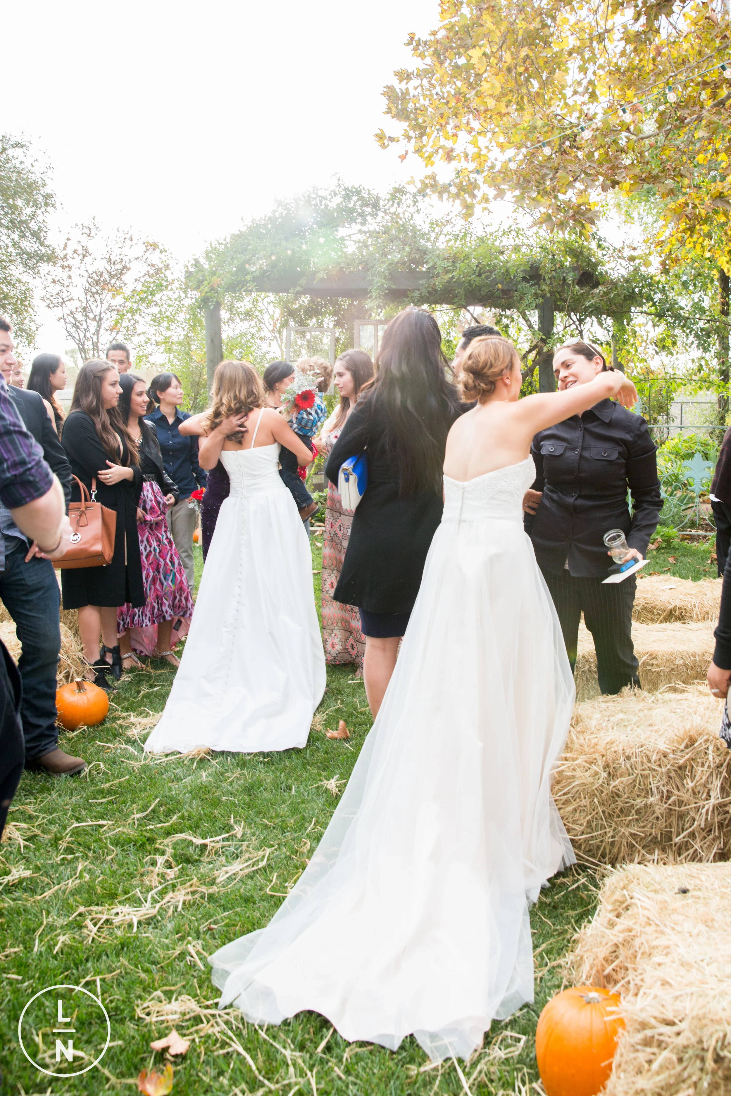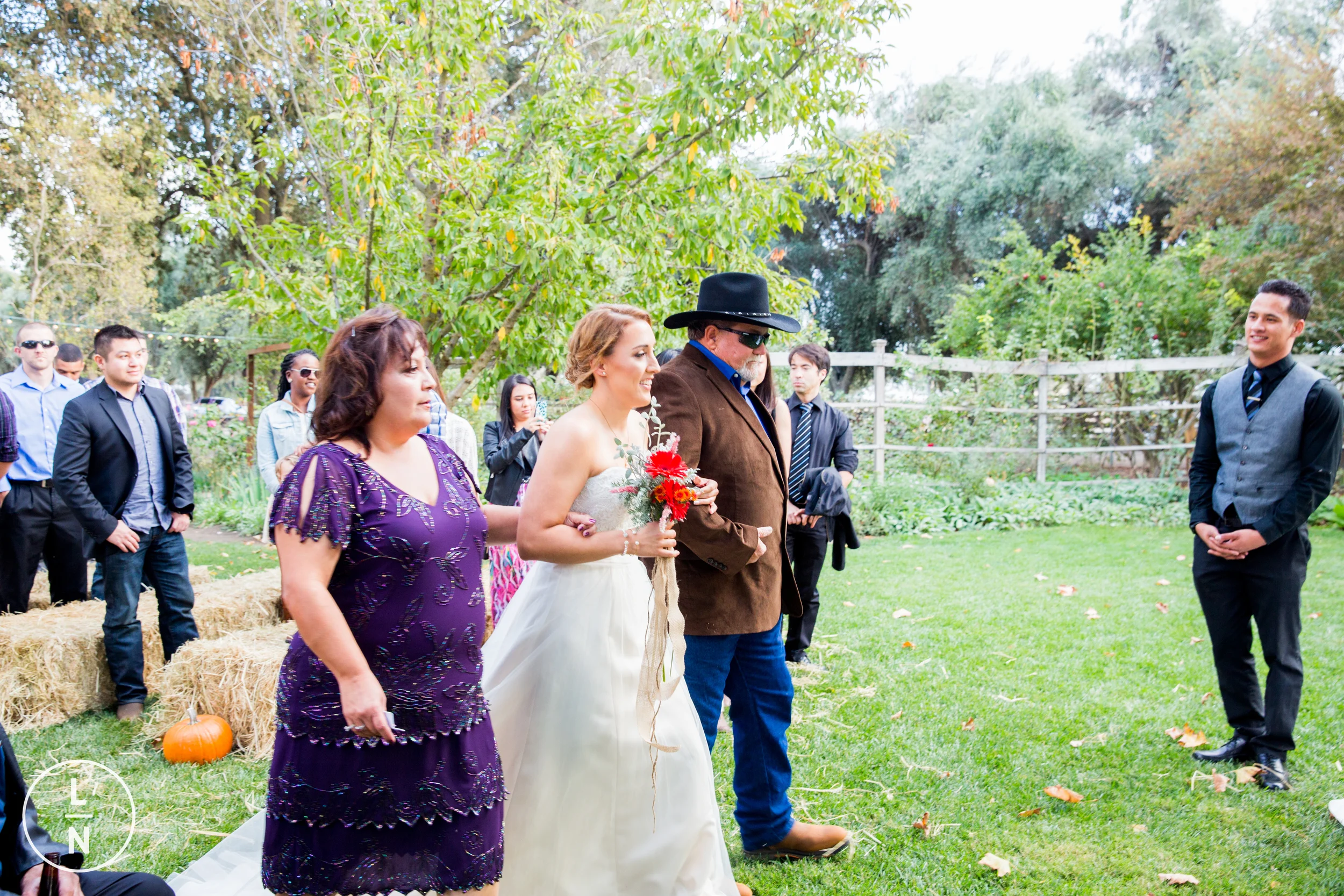 Guest waiting for the beautiful brides to come out. The haystacks were such a nice element to the boot scootin' wedding.